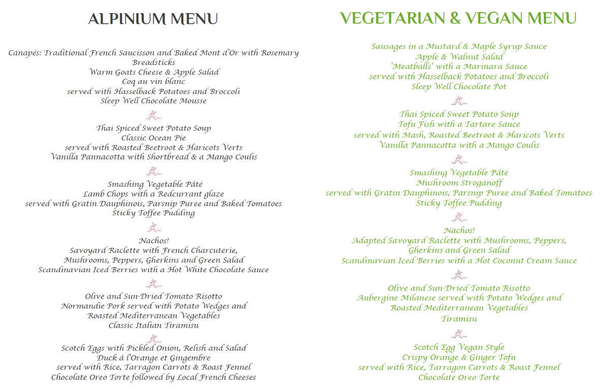 We've spent years refining the menus and adapting to new ingredients and changing tastes. We also have to cater for all dietary requirements and with the increase in people opting for a flexitarian or 100% plant based diet, we now have two menus to choose from on all our catered ski chalet holidays; our traditional meat and fish menu or our vegetarian, vegan, dairy free, plant-based menu. Both are equally delicious and available on all our holidays!